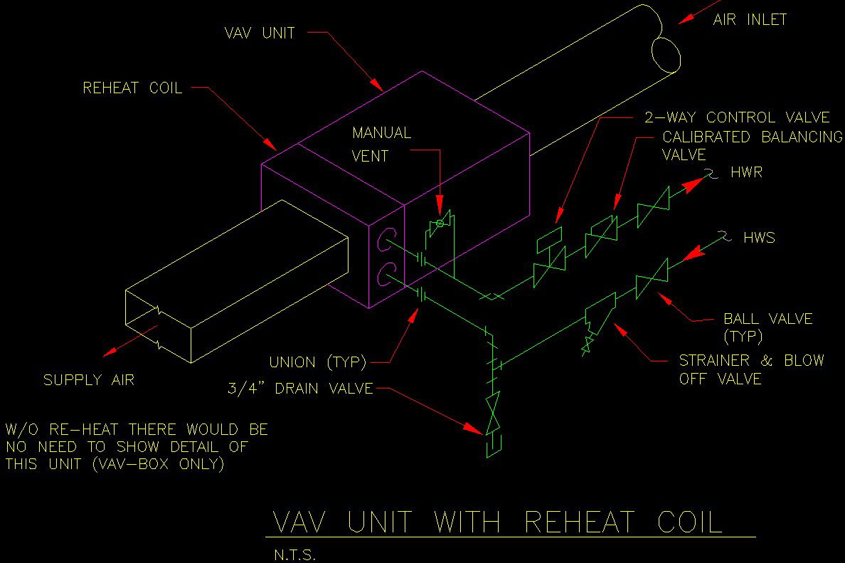 Here VAV unit with reheat coil including vav unit , air inlet , ball valve , strainer and blow valve ,union 3/4'' drain valve , supply air , vav unit . manual unit , hwr ,hws the air is pre heated at he central unit; its temperature is being automatically controlled. The air terminals are equipped with electric or hot water heating elements. These raise the temperature of the air to meet the demands of the room thermostats which are individually set. reheating is to increase the quality of the steam at the turbine exit, not to increase the efficiency. The plenum fan may also reduce the space required in the mechanical room for the air-handling unit and the discharge duct work. Reheating in a reheat regenerative steam power cycle increases efficiency by increasing the average temperature of heat reception, but also increases the reversibility of feed water heaters by raising the temperature of the super-heated steam used for the regenerative process. for more details of VAV unit with reheat coil download this file