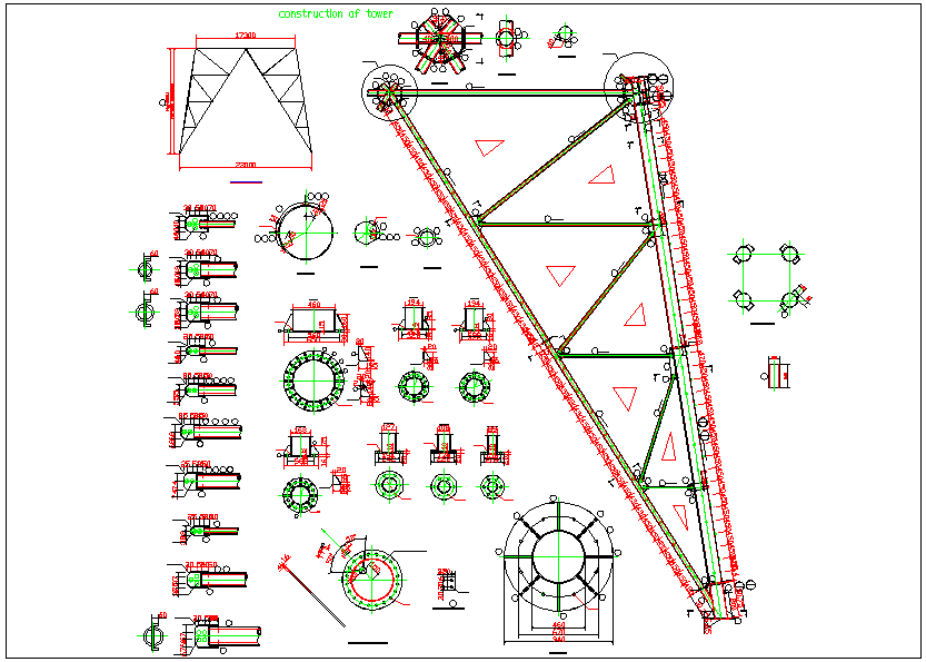 Construction detail of tower dwg file with vertical height of tower and dimension of tower with Chanel,angle and detail of dimension with different joint view.