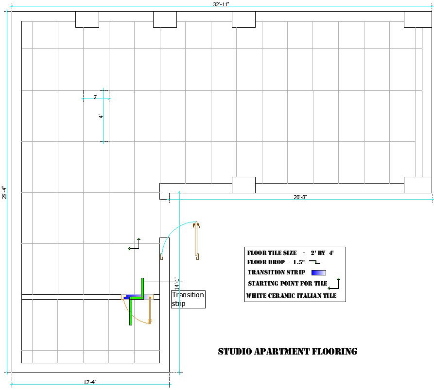 A studio apartment floor plan is in L shape, with a bedroom on one side, which provides a bit of separation from the living room and kitchen. here Studio apartment flooring including material used in tile is white ceramic Italian tile . transition strip is 14'-1'' , floor drop is 1.5'' , floor size is 2' x 4' also in drawing show dimension details for more details of Studio apartment flooring download this file .