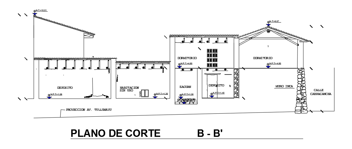 22x8m house building front cut section cad drawing is provided in this model. This is two story house building. On this first floor cut section, a storeroom, master bedroom, common bathroom, and column line is mentioned.