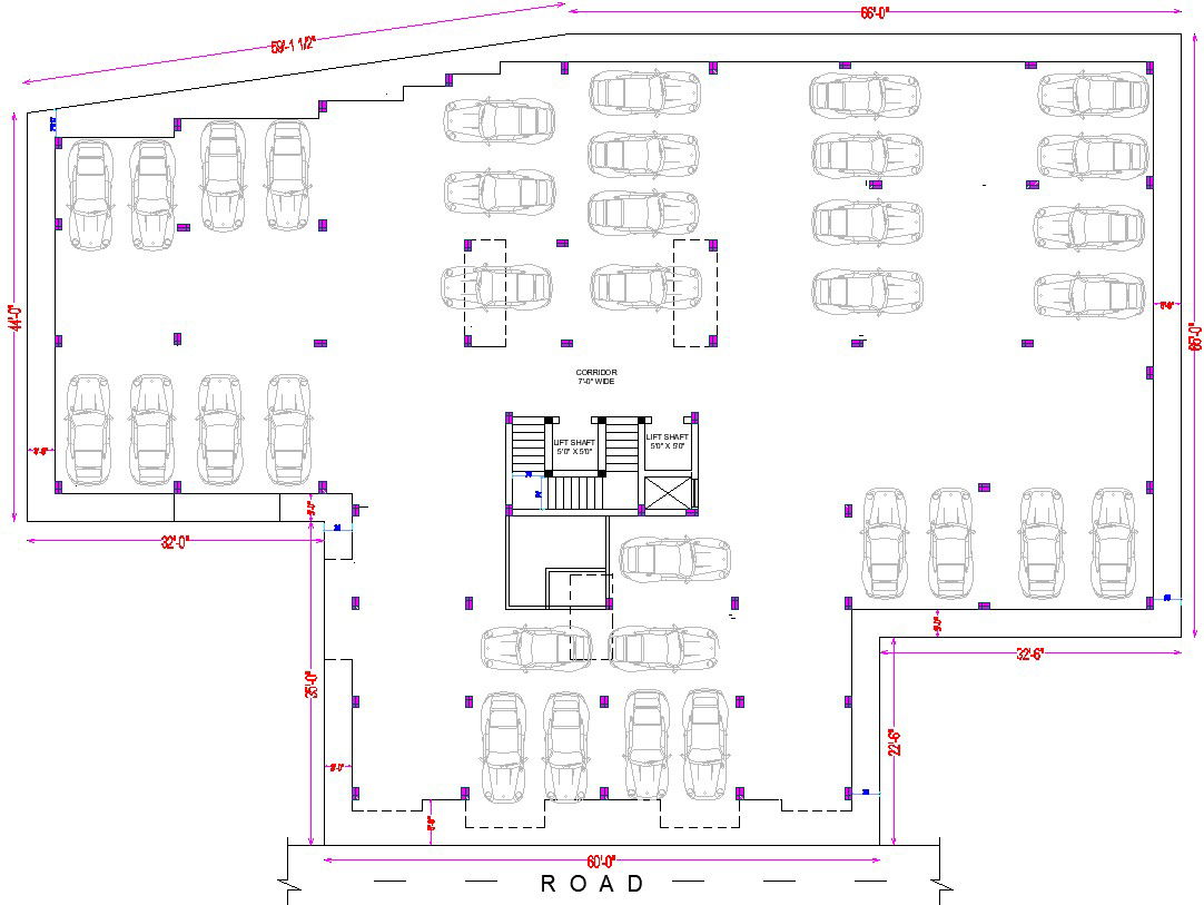 Here parking area layout including give sufficient space for car parking an area provided for the parking of motor vehicles and may include aisles, parking spaces, the minimum size of a car parking space is 2.5 m (8'2”) wide and 5 m (16'4”) long .he ratio method is based on the ratio of the floor area of the building (L) to the units of parking space (SRP), which is divided into road sections or parking blocks. although parking ramp slopes up to 7% are tolerated by the public in very dense urban areas. Parking ramp slopes should not exceed a 6.67% slope ,in this layout show underground parking area that provide lift and stairs to and also show details dimension of layout for more details of Parking area layout download this file.