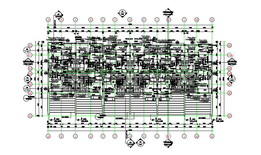 This Architectural Drawing is First floor structural plan layout of a house building. A framing plan is a plan that's designed to show the locations, materials (e.g. steel, timber), sizes, spacings and numbers of the structural elements that will be used to build your house. Framing plans for floor and roof construction can be derived directly from the floor plan and must incorporate all information that deals with the configuration of the building. Further, the framing plan shows the layout of the supporting features such as bearing walls, columns, beams, and girders. The floor framing plan (Figure 7-34) is a plan view of the layout of girders, beams, and joists. Joists and double framing are drawn in the position they will occupy in the completed building. Joists do not need dimensions at every location. For more knowledge and information download the drawing file.