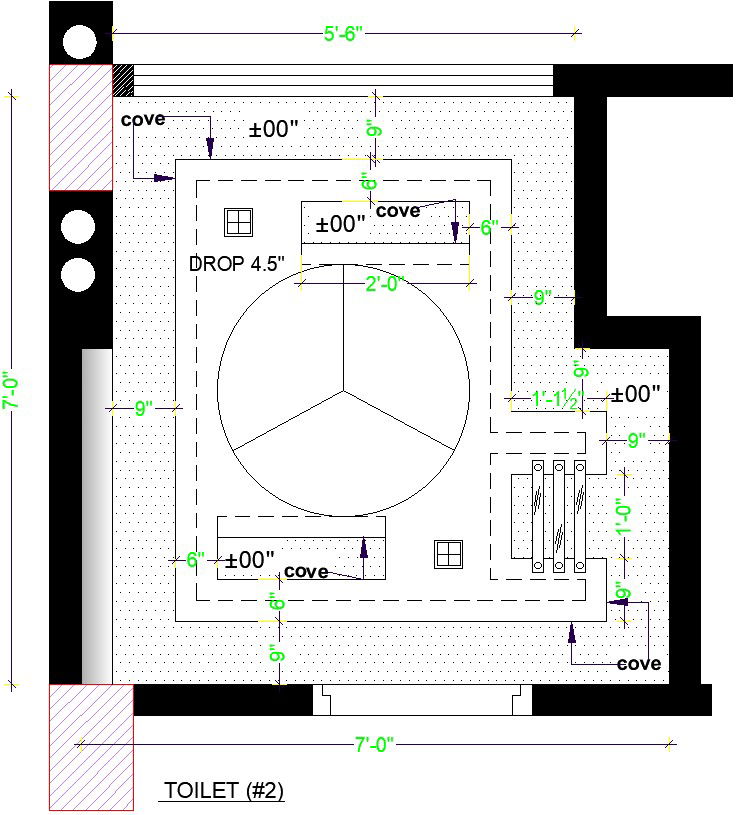 Here Ceiling plan of toilet Choosing colors and materials (such as wallpaper, wood or stucco) is a good way to start, if you decide on a counter-top, you can install some lights and create amazing effects. Modern ceiling design should not contain any harsh elements or lush decorations. in this drawing dhow drop 4.5''also show 1' distance between two lights. in this plan show two drops , also show different texture , wooden strips and round radius design is 2' approx that show in drawing , for more details of Ceiling plan of toilet download this file.