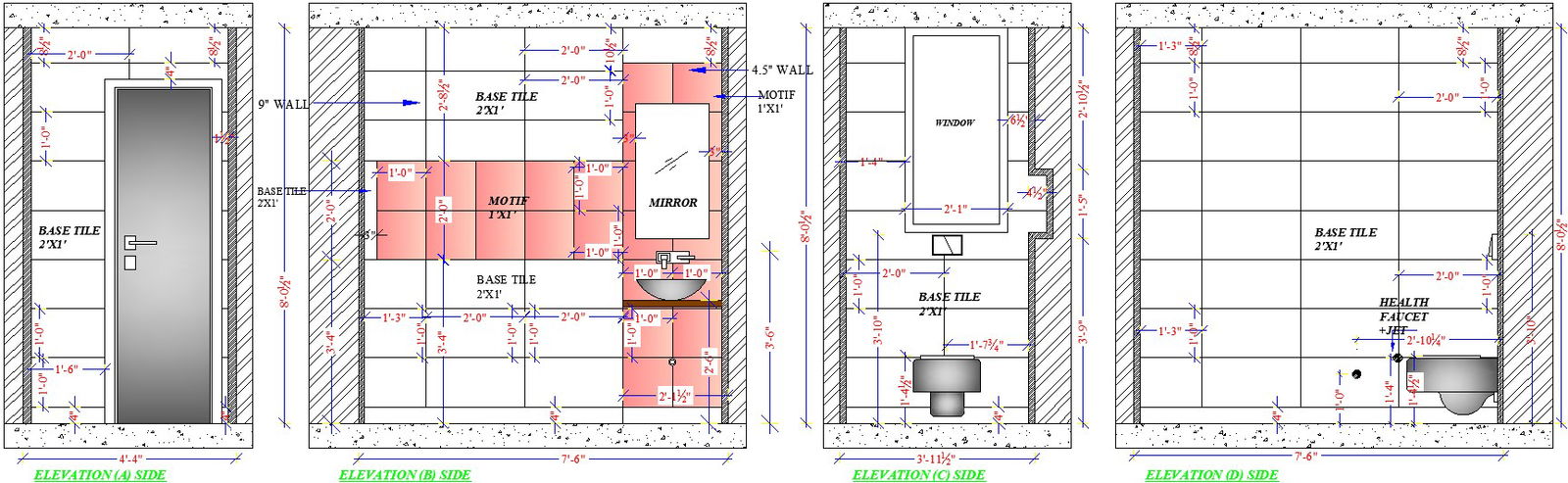 Here Elevation of toilet detailing The drawing shows the working drawing details for the toilet with its design layout, material specification, wall and floor finishes and slopes. The drawing comprises of the plan, Toilet size 1800x2400 mm. (6'x8') has got WC, Basin and Shower Area. Drawing accommodates complete working drawing detail with the required section, elevation and material specification detail. toilet sizes are usually between 27 to 30 inches deep; that is 69 to 76 cm, about 20 inche s in width the water valve for the incoming water to the top of the toilet supply tank. The pipe fitting for the water valve likewise is 5.5″ above the finished floor. also in drawing shows motif tile size is 1' x 1' that show in vertical t , base size tile is 2' x 1' also in this plan show different elevation side view , front view , left and right side view for more details of Elevation of toilet detailing download this file.