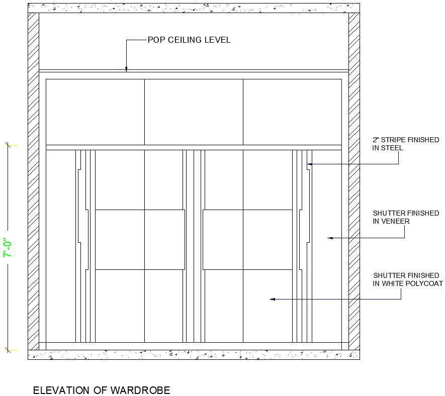 Here Elevation of wardrobe The height of the wardrobe should either match the lintel-level of the doors, which is usually 84 inches, or you can create a full- height wardrobe by using the space from the floor to the ceiling. The door-panel of a single-door or double-door wardrobe should not exceed 24 inches in width, otherwise there will be too much load on the hinges. also including pop ceiling , shutter finished in veneer , shutter finished in white coat 2'' finished in steel for more details of Elevation of wardrobe for more details of Elevation of wardrobe download this file.