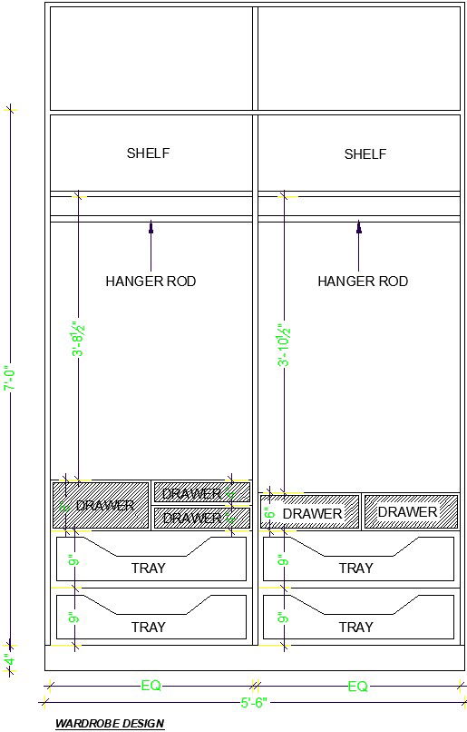 Here Wardrobe component details including drawer , tray and hanger rod in elevation of wardrobe there are shown two horizontal shelf in wardrobe tray and drawer size is 9'' and width of wardrobe is 5'-6'' skirting of wardrobe is 4'' and height of cupboard is 7'-0''An intelligently designed wardrobe provides ample storage space so you can keep your belongings in an organized way. It usually consists of three basic elements: Hanging closet, drawers and shelves to arrange your clothes, accessories, shoes, and other essentials in a clutter free manner. for more details of Wardrobe component download this file.