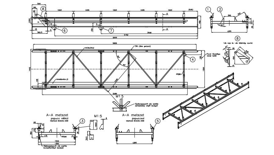 A truss is essentially a triangulated system of straight interconnected structural elements. The most common use of trusses is in buildings, where support to roofs, the floors and internal loading such as services and suspended ceilings, are readily provided. Trusses are most commonly used in bridges, roofs and towers. A truss is made up of a web of triangles joined together to enable the even distribution of weight and the handling of changing tension and compression without bending or shearing. It consists of a frame of axially loaded members that are either in tension or compression and are interconnected at the joints. Trusses are structurally engineered to be efficient structural systems where every component is critical to the long-term durability and strength of the truss. For more details and information download drawing file.