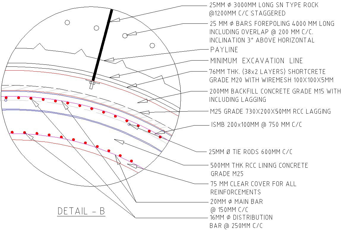 The reinforcing steel—rods, bars, or mesh—absorbs the tensile, shear, and sometimes the compressive stresses in a concrete structure. Plain concrete does not easily withstand tensile and shear stresses caused by wind, earthquakes, vibrations, and other forces and is therefore unsuitable in most structural applications. There were 25mm, 20mm, 16mm diameter bars are used in construction of tunnel. There were M25, M20, M15 grade of concrete is used. For more details and information download drawing file.