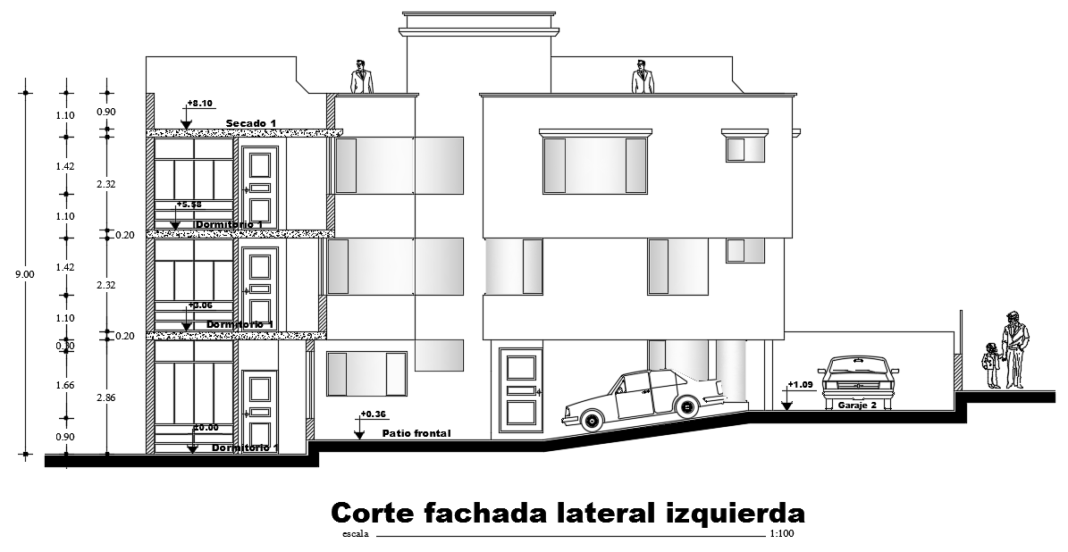 21x20m house building left side elevation view is given in this file. This is 3 story multifamily residential building. The total height of the left side building is 9m. Ramp is provided to the garage.