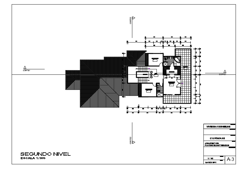 36x13m second floor bungalow house cad drawing is given in this file. This is G+ 2 bungalow house building. On this second floor plan, the living hall, master bedroom with the attached bathroom, mini bar, guest room, kid’s room, and common bathroom is available.