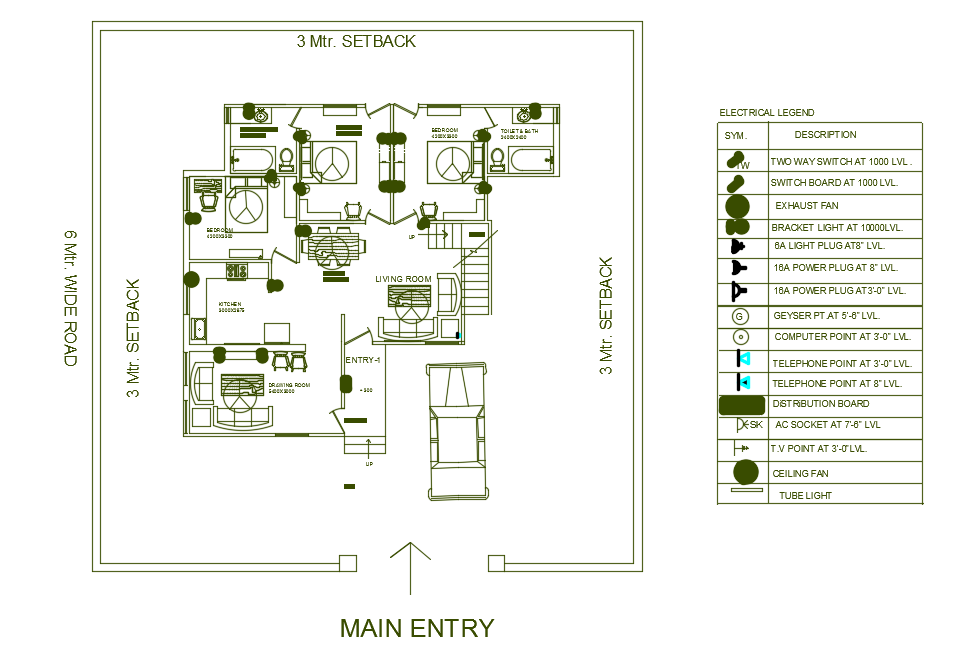 10x12m house building electrical description and symbol drawings are given in this file. 6m wide road is provided to the left side of the house.