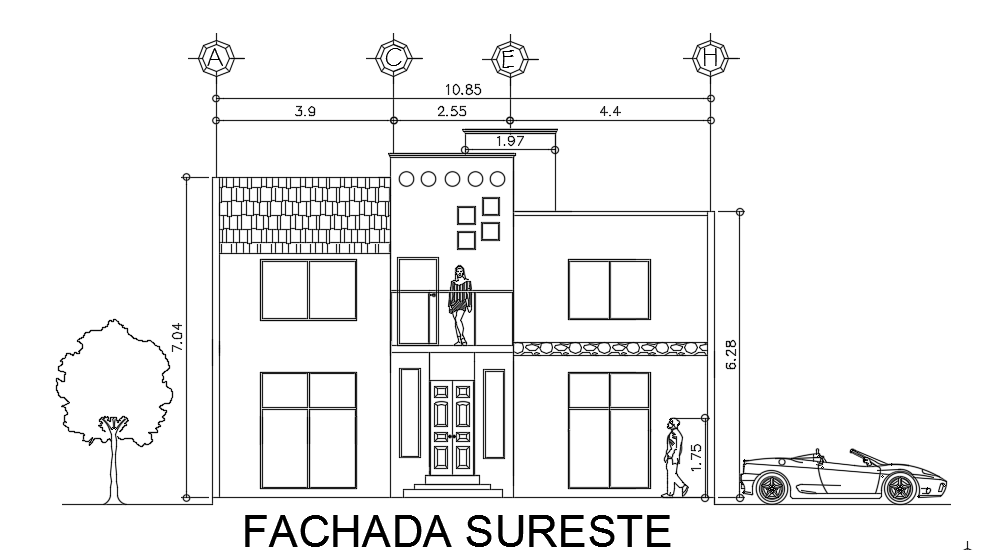 The south side elevation view of the 11x22m villa building is given in this model. This is two story residential building. The total height of the building is 7.04m. The double side opening main door is provided. In this elevation, the stone design is provided in between ground and first floor building. A car parking is provided at the right side. The length of the plan is 10.85m.