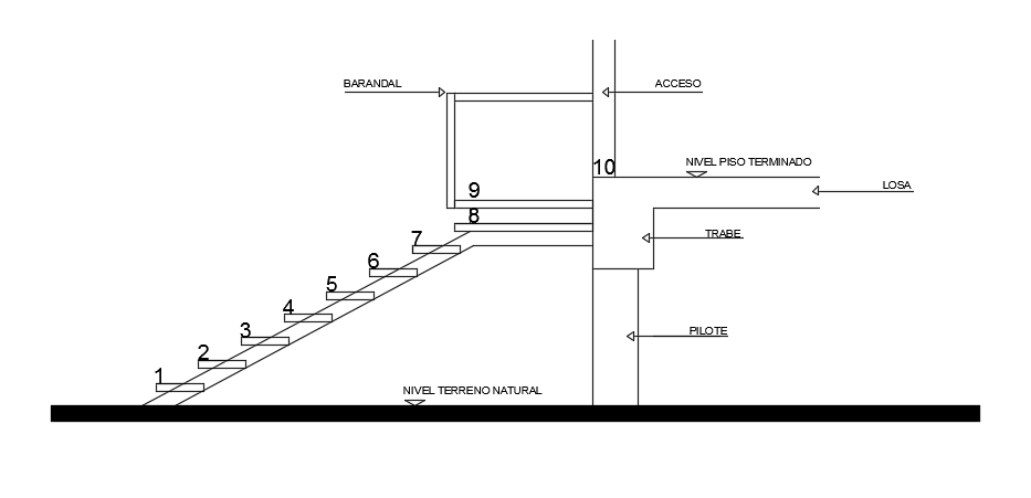 A section view of the 10x13m bungalow building staircase is given in this file. In this drawing, the ground floor staircase section cad model is given. The breadth of the staircase is 1m.