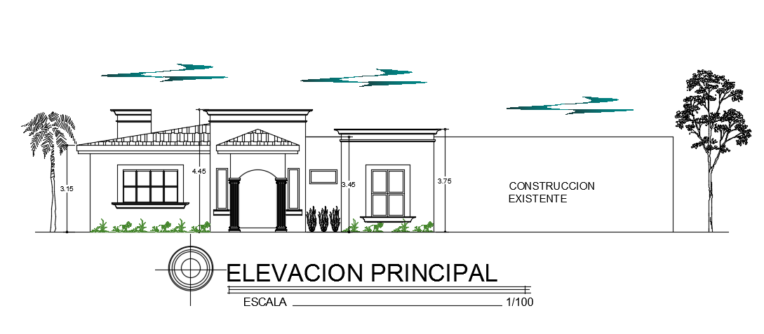 22x13m house building main elevation 2d AutoCAD drawing is given in this file. This is single story house building. The main door and porch is showed. The total height of the building 4.45m. An existing construction building is presented. This elevation drawing is given with 1:100 scale.