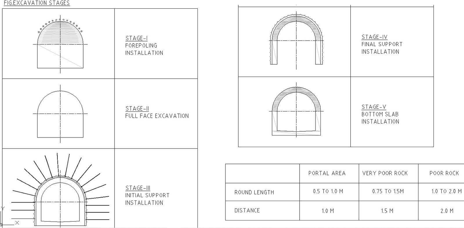 This architectural drawing is Excavation stages of tunnel in detailing. The aim of the excavation cycle is to break up the rock with explosives, giving the required cross-sectional shape while the tunnel advances proportionally to the length of the drilling in the tunnel face. In this way, with successive cycles, the infrastructure is built gradually until the tunnel has been completed. In this drawing different stages of excavation of tunnel are given. For more details and information download the drawing file.