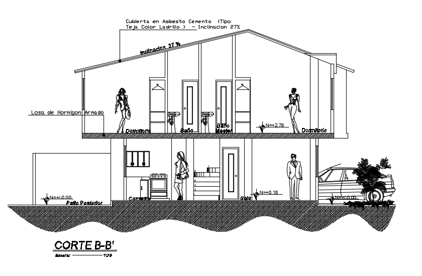 6x8m house building left side cut section view cad drawing is given in this file. This is a two story residential building. On this ground floor building, the living room, back side patio, and dining room is presented. On this first floor building, the master bedroom, kid’s bedroom, and two common bathrooms are presented. A traditional A type roof is provided.