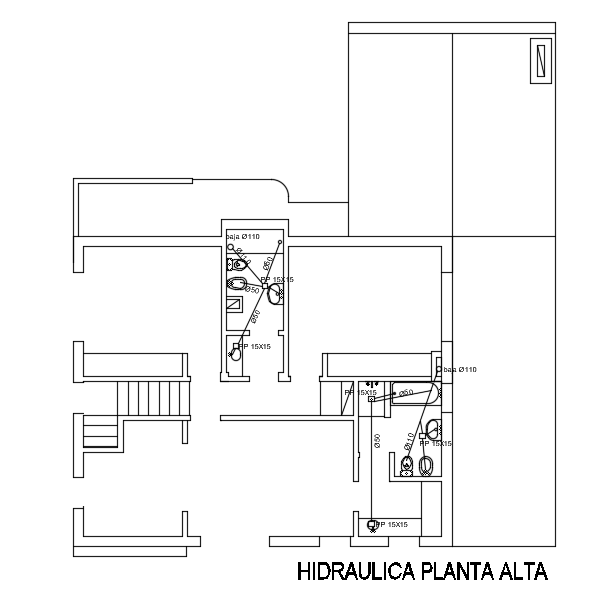 15x14m hose plan first floor hydraulic line 2d drawing is given in this file. In this drawing, the water lines are provided to the attached bathroom, and common bathroom.