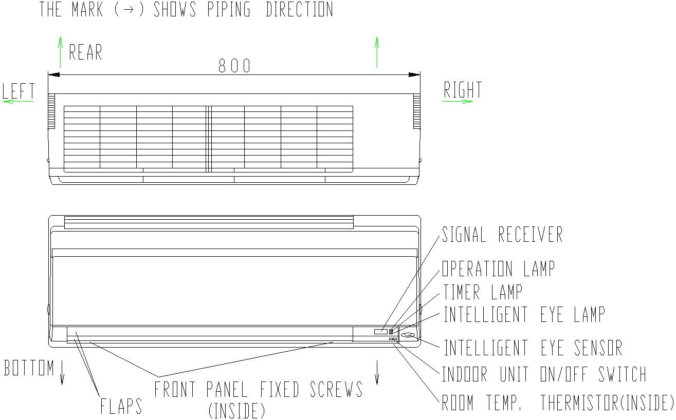 This Architectural Drawing is of Air Conditioner front side elevation in detail. In this Drawing, the signal receiver, operation lamp, timer lamp, Intelligent Eye Lamp, Intelligent Eye sensor, Indoor unit ON/OFF Switch, Room Temp. Thermistor(inside). The Mark (arrow)in the drawing shows piping direction. In a 10 ft high room, for optimum cooling, a height of 7-8 ft above the ground is recommended. This will ensure that the cool air spreads well around the room. It also ensures that the air conditioner is not too busy cooling the hot roof which only means higher electricity bill for you. For more details and information download the drawing file.