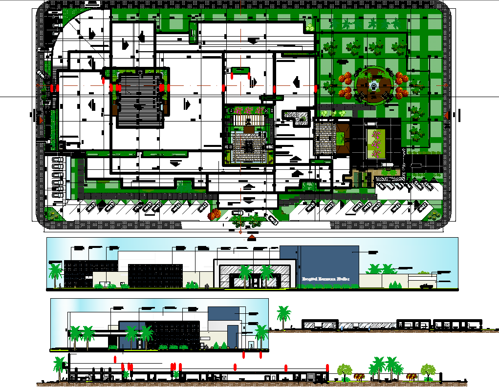the architecture layout plan with landscaping design, parking manage, section plan, structure plan and elevation design of Hospital Project.