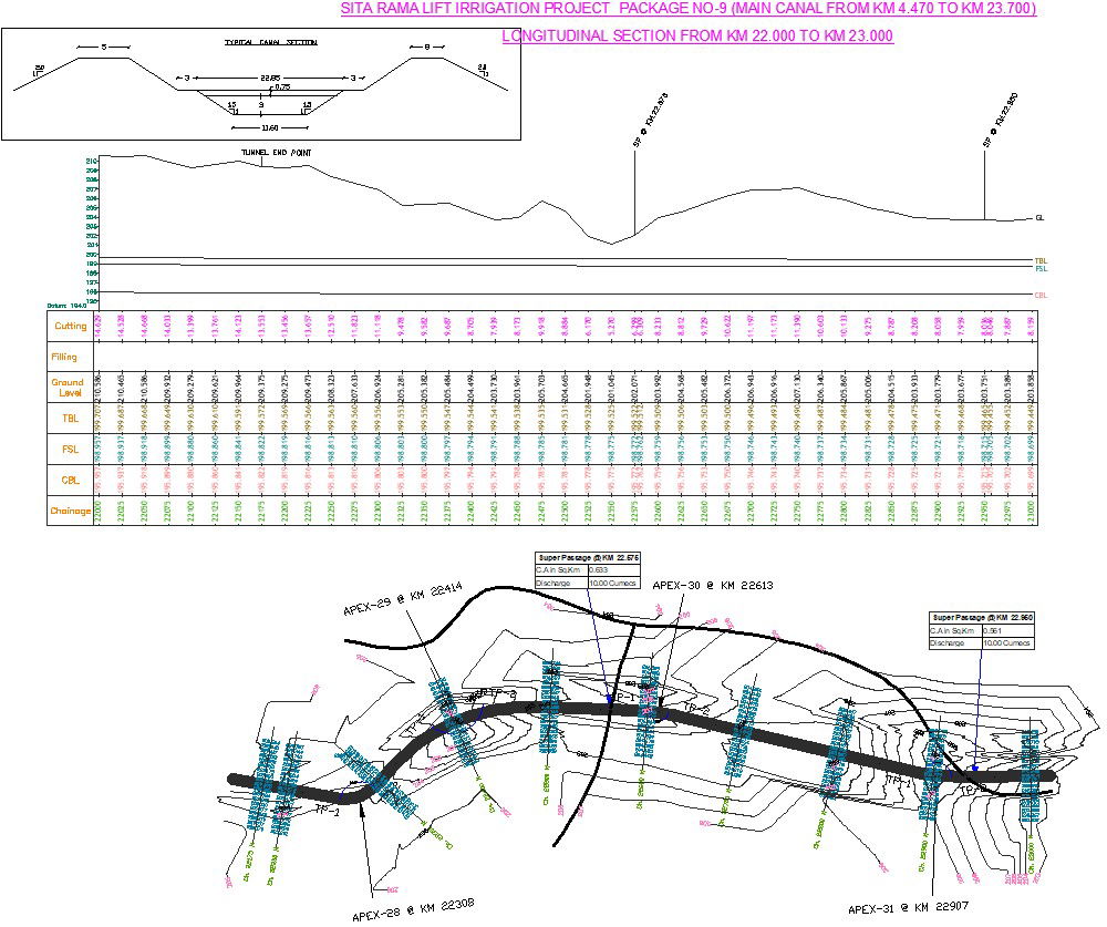 This architectural drawing is Longitudinal section of main canal with plan and detailing. This drawing includes data of cutting, filling, ground level, TBL, FSL, CBL, chainage etc. The longitudinal slope of a canal therefore is also known or is adopted with reference to the available country slope. However, the slope of canal bed would generally be constant along certain distances, whereas the local ground slope may not be the same. The alignment of a canal system depends on the topography of the land and other factors. For more details and information download the drawing file.