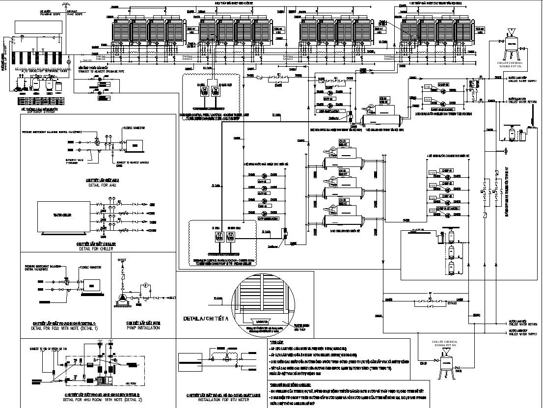 This Architectural Drawing is of SCHEMATIC DIAGRAM FOR CHILLER SYSTEM. A chiller is a machine that removes heat from a liquid coolant via a vapor-compression, adsorption refrigeration, or absorption refrigeration cycles. This liquid can then be circulated through a heat exchanger to cool equipment, or another process stream (such as air or process water). A chiller works on the principle of vapor compression or vapor absorption. Chillers provide a continuous flow of coolant to the cold side of a process water system at a desired temperature of about 50°F (10°C). The purpose of chillers, whether they're industrial or HVAC, is to move heat from one location and transport it to another place to chill. Chillers tend to use either water or another type of liquid to process it through the piece of equipment they're trying to chill. For more details and information download the drawing file.
