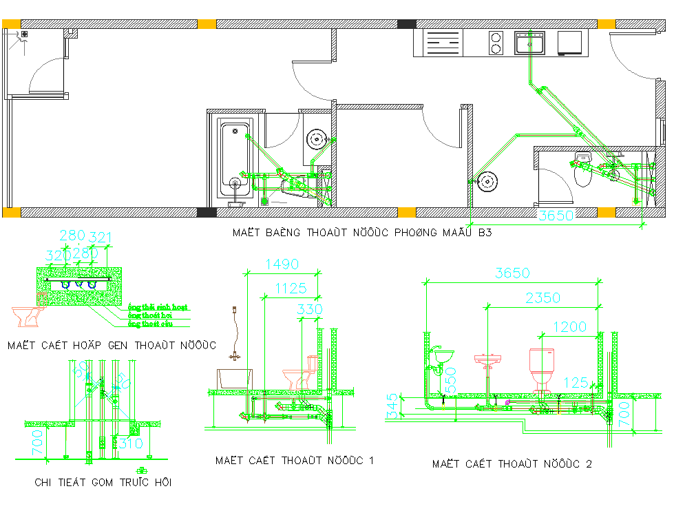 Plumbing Detail of House dwg file. Find here layout plan house plumbing detail in kitchen and bathroom- toilet with installation plan describe in section plan.