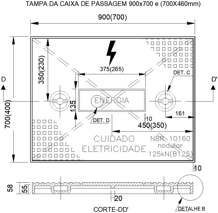 This architectural drawing is Drawing of junction box with detailing. In this drawing there were box dimensions are 900x700. There were also given section DD' with details B. Total height of section DD' is 58. For more details and information download the DWG file.