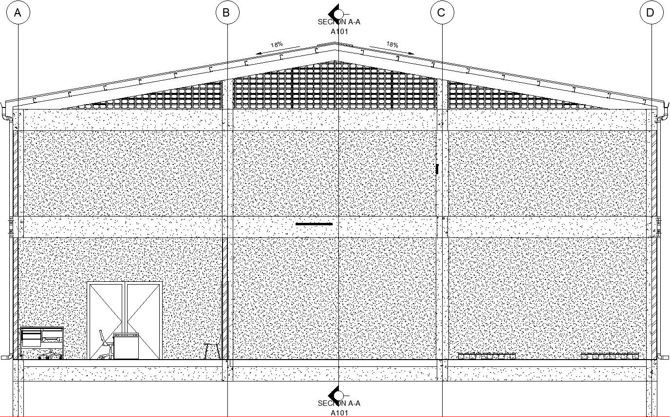 This Architectural Drawing is of Back side Sectinal elevation of a ware house. In this drawing the back side section is shown, the texture of material shown in the drawing the back acces door is also shown in the drawing. For more details and information down load the drawing file.
