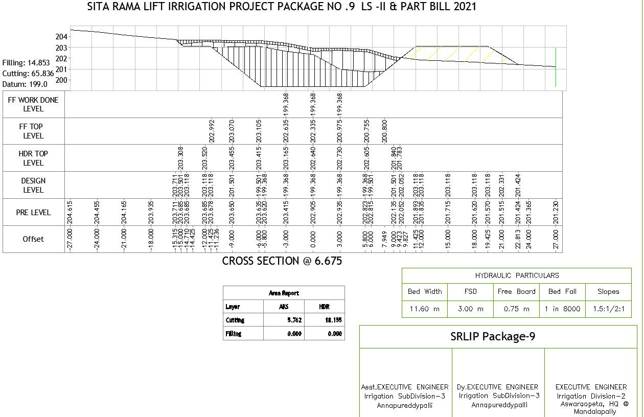 This architectural drawing is Cross section of Lift irrigation with detailing. In this drawing the portion in filling is 14.853, in cutting is 65.836 and the datum is 199. For more details and information download the drawing file.