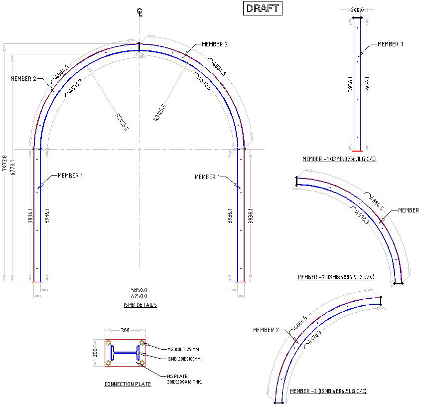 This architectural drawing is ISMB details of tunnel with dimensions . In this drawing ISMB plate details are given. There were used 25mm MS bolt. Size of ISMB is 200x100mm. Size of MS plate is 300x200x16 thick. For more details and information download the drawing file.