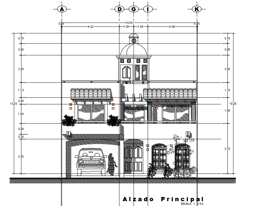10x12m house building front elevation 2d drawing is given in this model. This is double story residential building. The length of this house is 10m. The main door, car parking, and windows are visible in this ground floor building. On this first floor building, balcony, and small portico is visible.