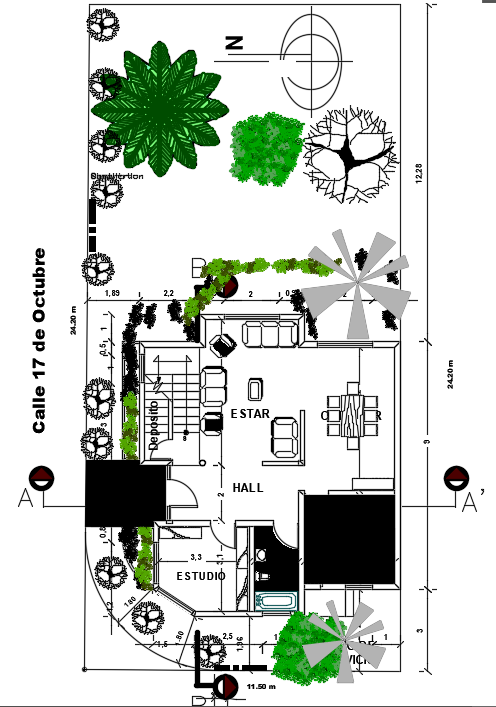 11x24m architecture 3bhk house plan 2d drawing is given in this file. This is two story residential building. This is duplex house building. On this floor plan, a car parking, living room, study room, kitchen, patio service, dining room, hall, family room, garden, and common bathroom is available. The length 24m including house plan and garden.