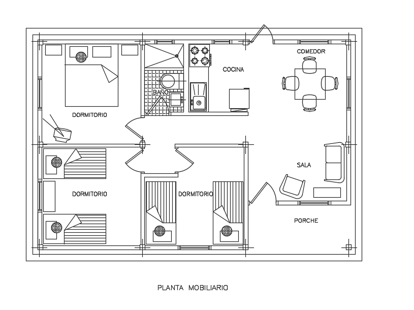 10x7m house plan furniture’s location 2d drawing is given in this file. Here, 3 bhk house plan. In this house, only one common bathroom is provided. Open kitchen is provided with dining room.