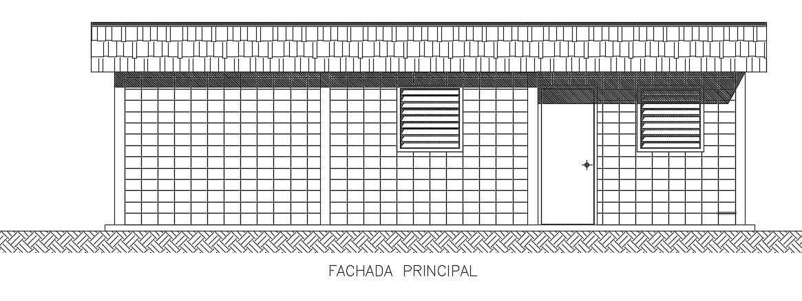 10x7m house building front side elevation view is given in this file. This is a single story house building with 3bhk. Here, the total height of the building is 3m and floor level height is 2.4m. In this drawing, living room window, kid’s bedroom window, and main door views are presented.