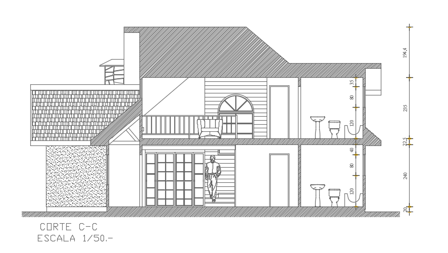 23x12m house building left side elevation view is given in this file. Here, two story cut views are given. In this cut section drawing, ground and first floor bathroom, living room, and closet views are given.