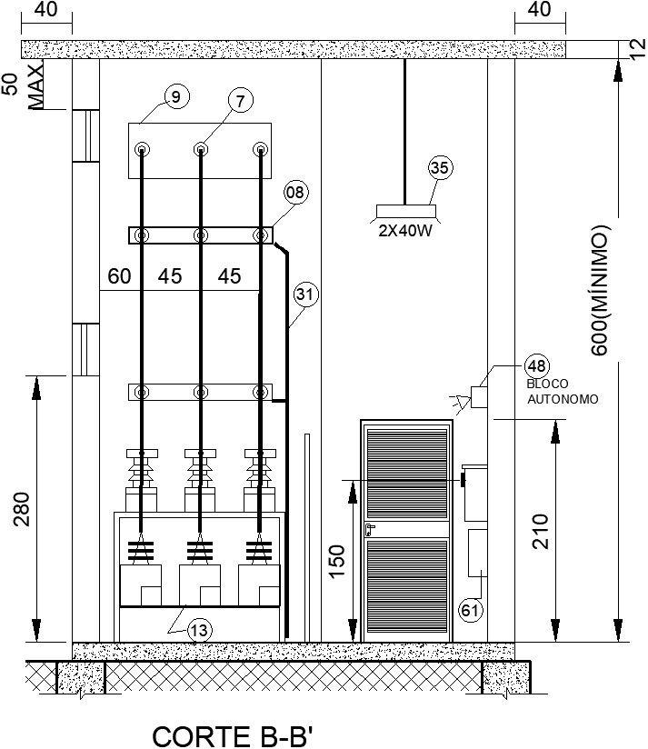 This architectural drawing is Power supply distribution system in AutoCAD 2D. It is a cross section BB' of thePower supply distribution system. In this drawing given door height is 210. Total height of system is 600. There were slab thickness is 12cm. For more details and information download the drawing file.