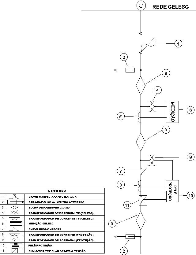 This architectural drawing is Layout plan of celesc network. In this drawing There were relay protection at point 10 and measurement at point 6. Measurement and protection substation above 300kVa input, measurements are in meter and it is a single diagram. There are also given table of symbols and their notations. For more details and information download the drawing file.