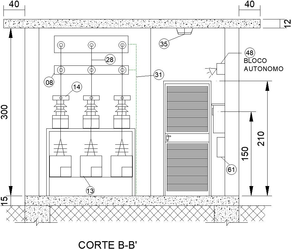 This architectural drawing is 2D drawing of cross section BB' of electric power distribution system. In this drawing the distance between two slab is 300. The height of the door is 210. Transmission of the electricity is from the power station, electrical power will be transmitted from the power stations to substations. For more details and information download the drawing file.