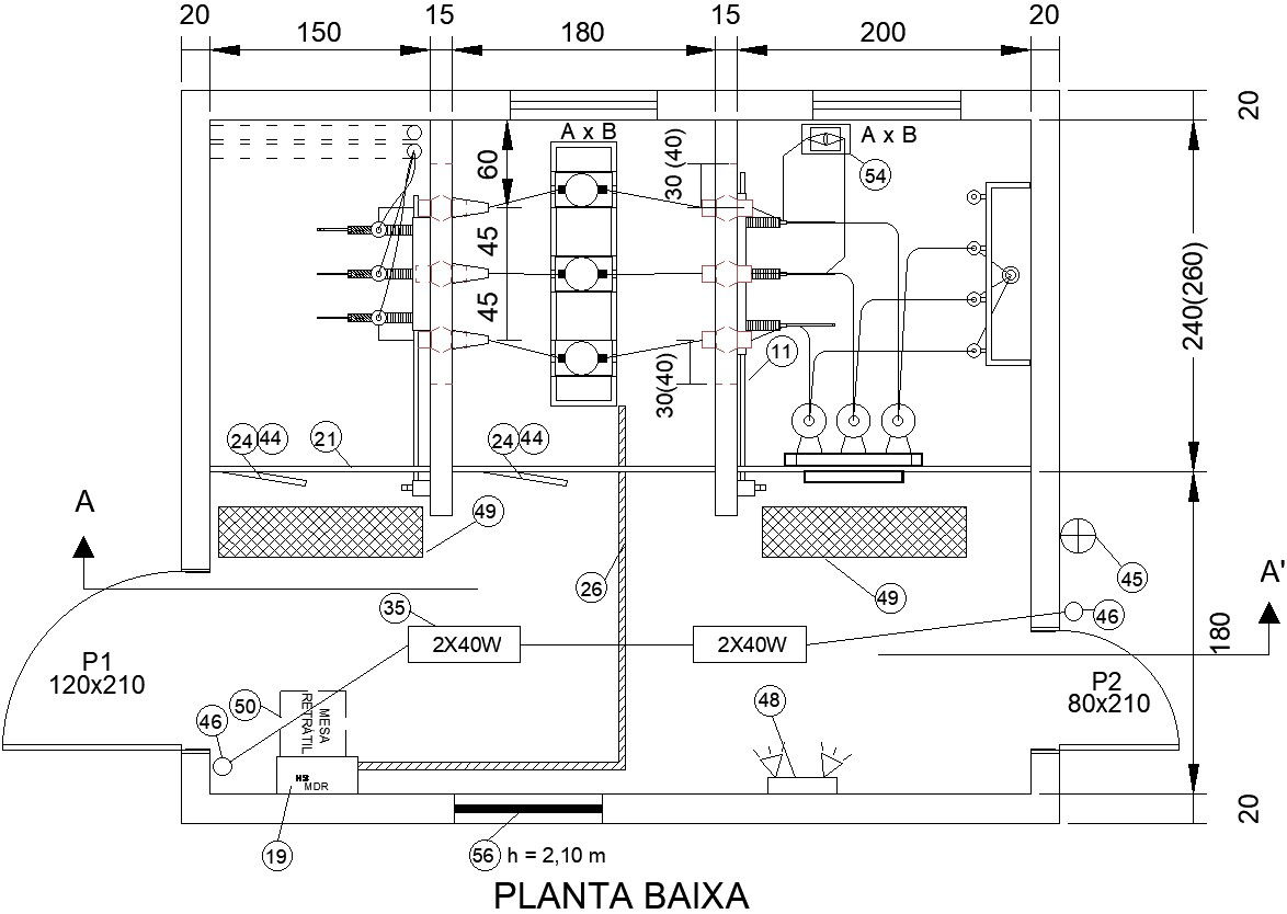 This architectural drawing is Plan of electric power distribution system in AutoCAD 2D. In this drawing there were given plan dimension is 600x480 approximately. there were given size of door P1 is 120x210 and door P2 is 80x210. The height of the plan is 2.10m. For more details and information download the drawing file.