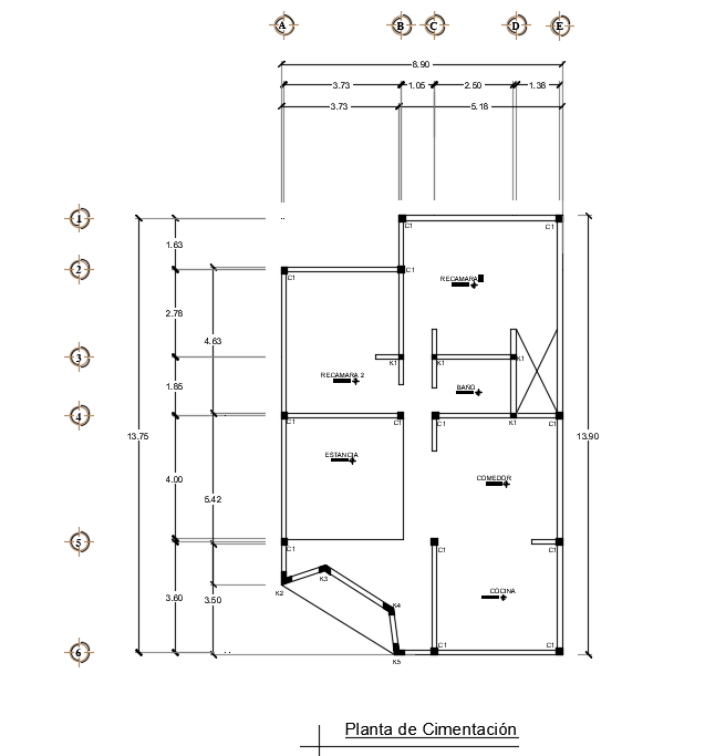 The column layout of the 9x14m house plan 2d AutoCAD model is given. In this drawing, beam and column layouts are given.