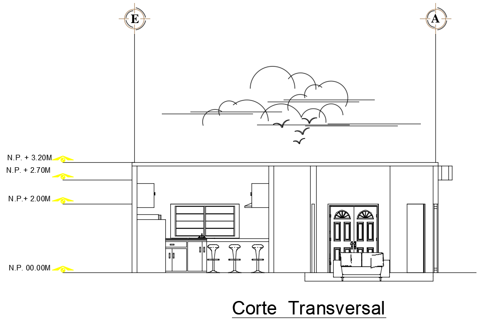 The front cut view from back side of the 9x14m house building is given. In this, kitchen, and main door views are presented. The height of the building is 3.2m.