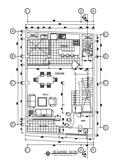 8x10m house plan second floor AutoCAD drawing is given in this file. This is four story residential building. In this second floor, mini bar, living room, balcony, hall, kitchen, dining room, patio service, and common bathroom is available. The staircase is provided inside of home.