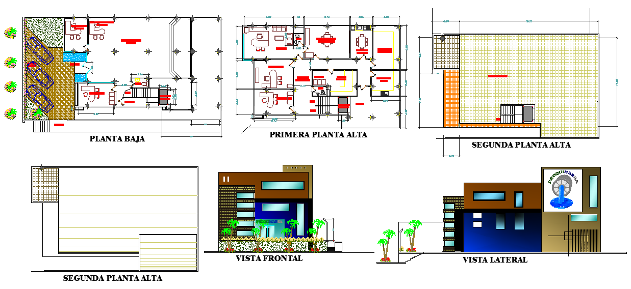 Corporate building, architecture layout, floor plan, structural plan, furniture layout, exterior elevation.