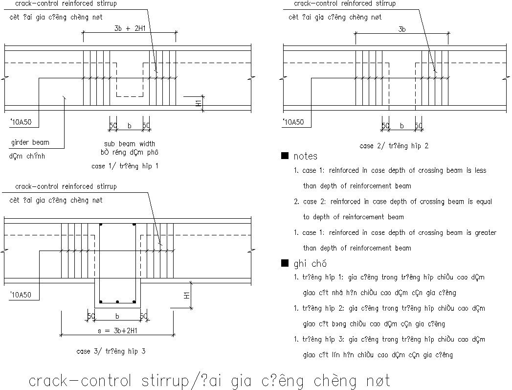 This architectural drawing is Design of crack control stirrups. In this drawing there were given three cases in drawing. In case 1 reinforced in case of depth of crossing beam is less than depth of reinforcement beam. In case 2 reinforced in case of depth of crossing beam is equal to depth of reinforcement beam. For more details and information download the drawing.