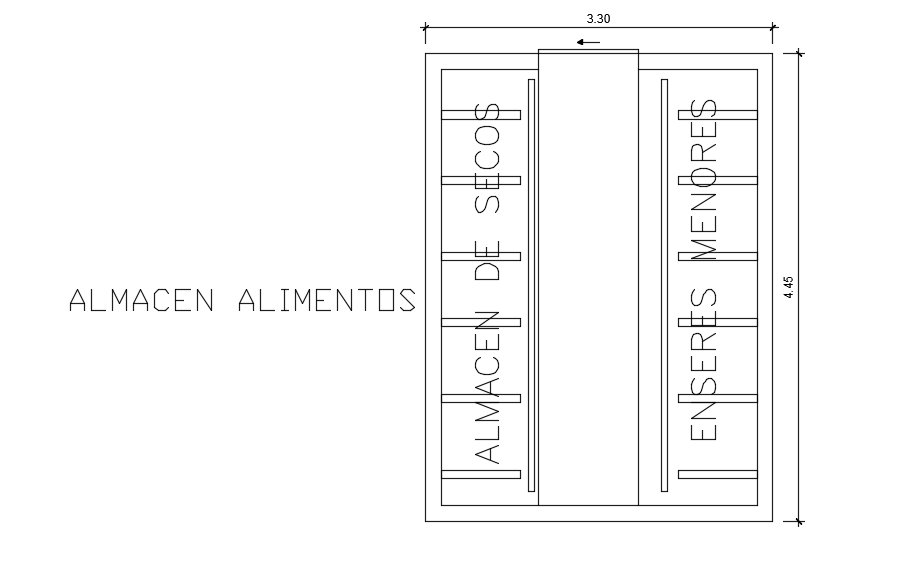 3300x4450mm hospital food store AutoCAD plan is given. Here, the right side warehouse is provided. On this left side, minor appliances are provided.