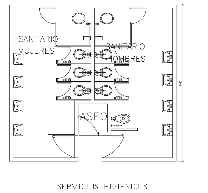 6850x6430mm hospital common bathroom plan AutoCAD drawing is given. In this plan, female and male bathroom plan is given. Here, 8 washbasin, 6 water closet, and one urinal is provided.