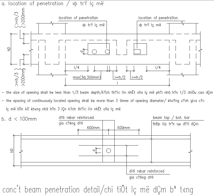 This architectural drawing is Concrete beam penetration detail. In this drawing there were given location of penetration. The size of the opening shall be less than 1/3 beam depth. The spacing of continuously located opening shall be more than 3 times of opening diameter. For more details and information download the drawing file.