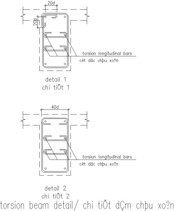 This architectural drawing is Design of torsion beam detail. In this drawing there were given details of torsion beam. There were given 20mm diameter in detail 1 and 40mm diameter in detail 2. In both drawings torsion longitudinal bars are located. For more details and information download the drawing file.
