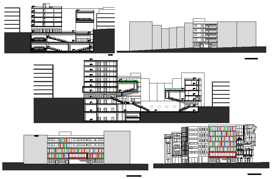 Mixed-use Complex, offices, housing, architecture layout with detailing, sectional plan,floor plan, furniture layout, sectional elevation of individual floor, exterior elevation.