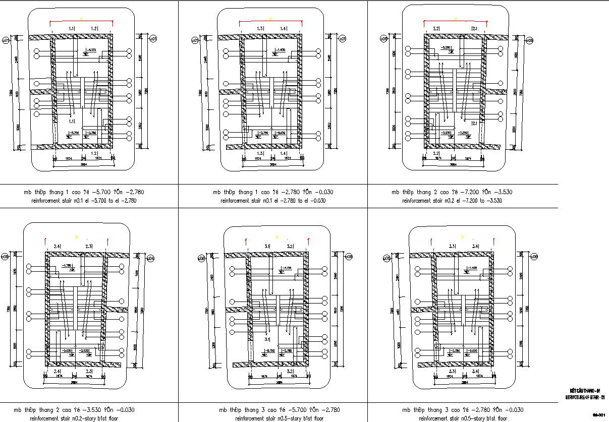 This architectural drawing is Reinforcement details of structure of stair. The simplest type of staircase consists of an inclined, reinforced concrete slab. It is supported at its ends by beams, and steps are formed on its upper surface. A horizontal landing slab may be included at one or both ends. For more details and information download the drawing file.